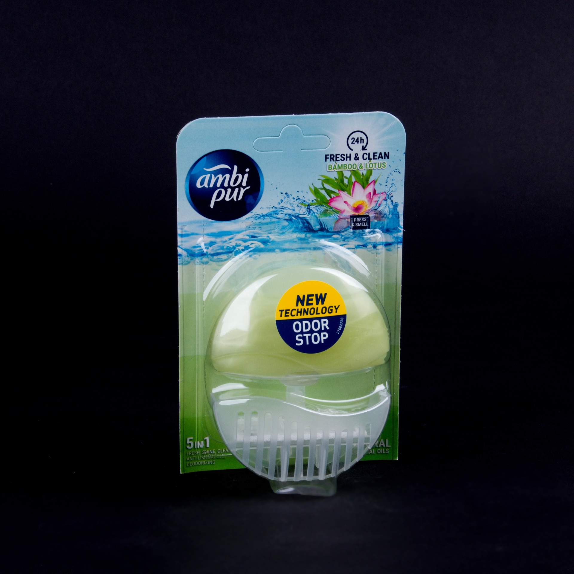 WC závěs AMBI PUR Bambus a lotosový květ je koncentrovaný tekutý čisticí prostředek, který pomáhá předcházet usazování vodního kamene. Mušle čistí při každém spláchnutí. Zanechává toaletu svěží, lesklou, čistou a provoněnou.